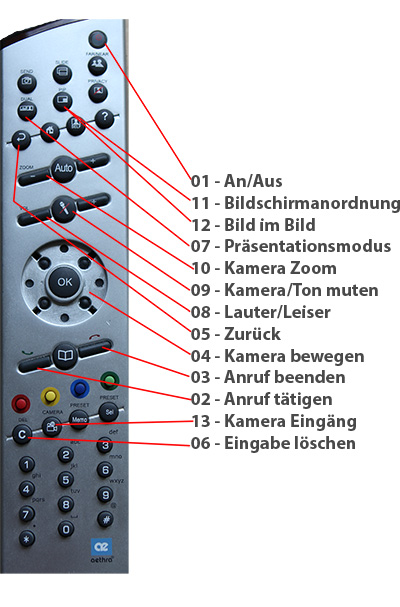 - Drücken Sie bitte nun erneut den grünen Hörer (02) auf der Fernbedienung um den Anruf zu initiieren.