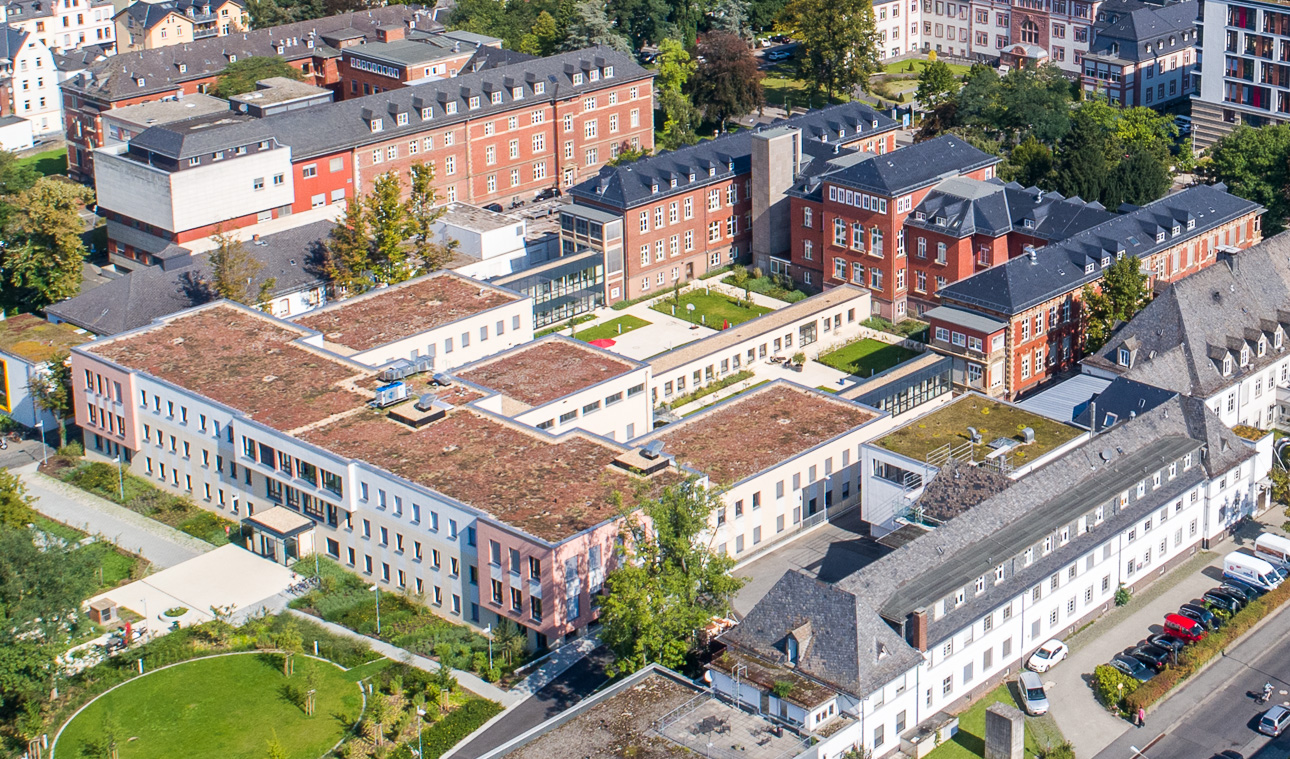 Der Nebeneingang (Nord) befindet sich auf Ebene 0 in der Klinikstraße 36. Der Haupteingang (Süd) auf Ebene 0 erreichen Sie über Am Steg.