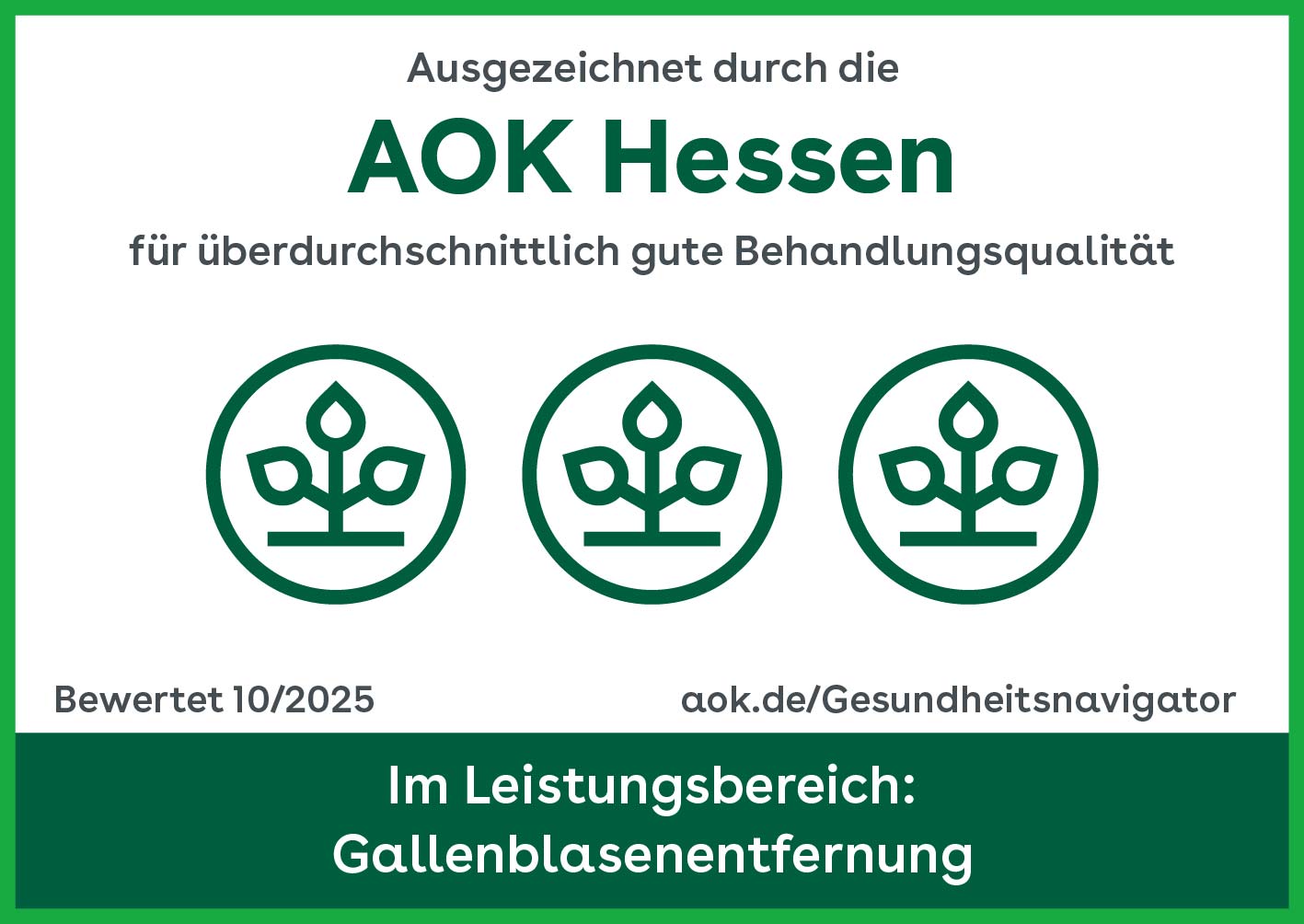 Auch in diesem Jahr ist die Klinik für VTG-Chirurgie erneut bezüglich Ihrer Qualität für überdurchschnittlich gute Behandlungsqualität im Leistungsbereich Verschluss eines Leistenbruchs sowie im Leistungsbereich Blinddarmentfernung von der AOK Hessen ausgezeichnet worden.